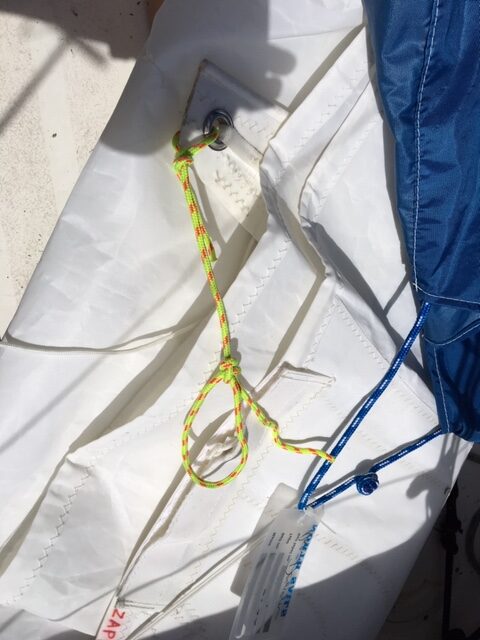 Die Kleine Fock hat am Segelhals ein gelbes Seil. Das ist das Vorfach , in welches das Vorsegelfall eingeschäkelt wird. Die kleine Fock befindet sich in der Bootskiste.