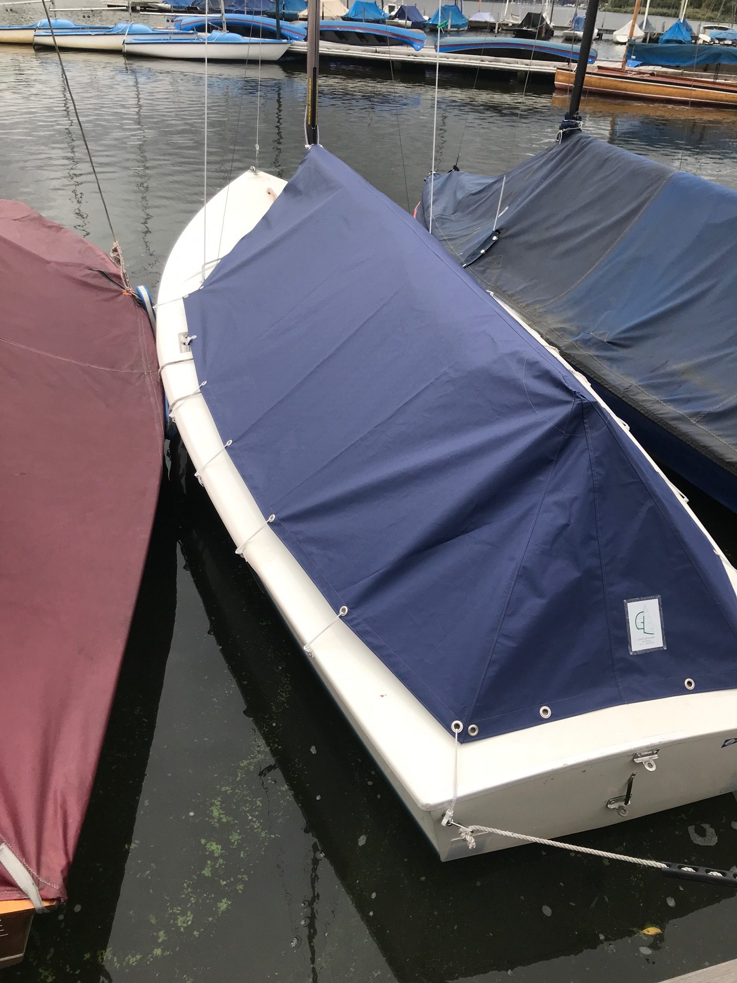 Die neue Persenning wird jetzt mit Haken befestigt. Es kann passieren, dass das Nachbar-Boot gegen die Haken drückt und diese sich lösen. Wir beobachten das bis zum Ende der Saison. Setzt die Haken bitte nicht an die breitesten Stellen des Booten (Soweit es geht). Vorne am Mast nicht zu fest ziehen. Die beiden hinteren Haken bitte in die Karabiner einhaken. Nach dem Abbau bitte klein falten und ins Schott legen.